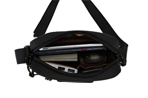תיק צד שחור עם נגיעות צהוב, חכם בסטייל ספורטיבי Slim Crossover עם חלוקה פנימית לנוחות מירבית עם בד דוחה מים ואבק. עוצב כדי לשמור עליך רגוע ומאורגן כדי שתוכל להישאר בשליטה בעבודה, תיק צד זה קל משקל ופונקציונלי להפליא. לתיק תא אחד מרווח ובתוכו חלוקה פנימית לנוחו מקסימלית, תא קדמי לשמירת חפצים ותא אחורי נסתר.